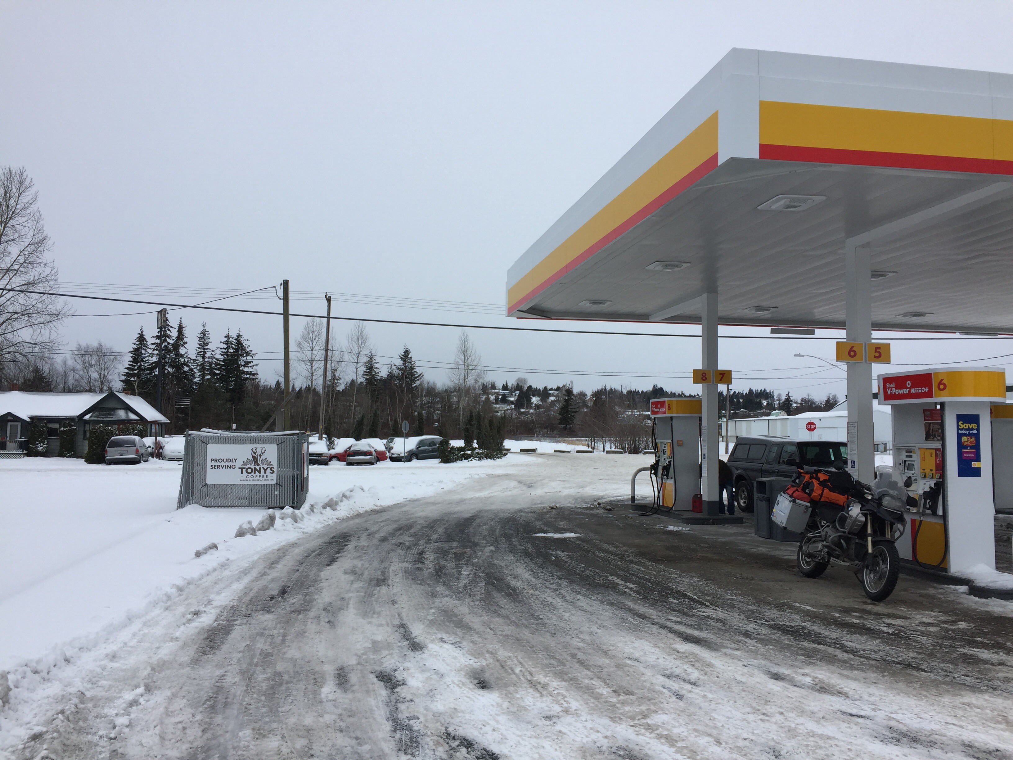 Since the lower mainland was calling for another big dump of snow this afternoon (10-15cm) I made the call to cross the ferry back to Vancouver from Victoria to head south on i5 and try to get out of this winter wonderland before it hit again. I started today in Victoria at +1c and it warmed up to a balmy +4c. I stopped in at Touratech in Seattle to pick up some parts and made it as far as Kelso, Washington before dark.